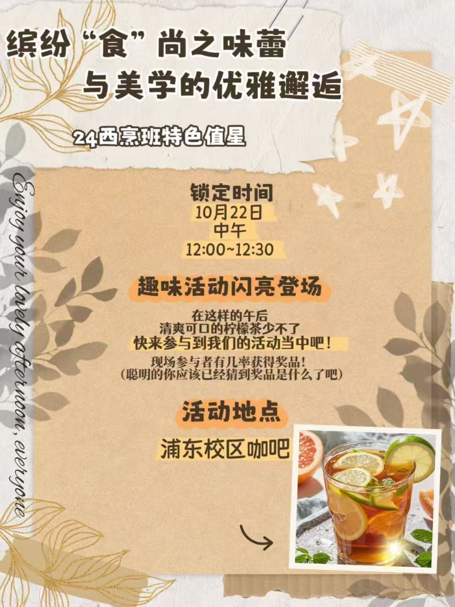 10月22日中午12:00-12:30,24西烹班于浦东校区咖吧举办“缤纷‘食’尚之味蕾与美学的优雅邂逅”特色值星活动。