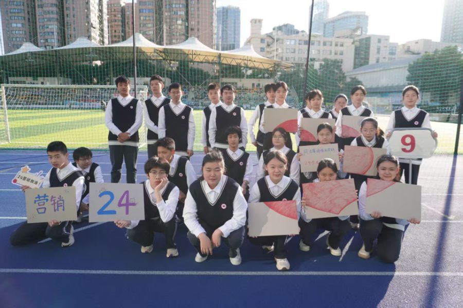 秋阳裹着风,蓝跑道接了绿茵场,身后城市楼宇与足球门成了天然背景板——24营销班的入场合影,每处都浸着少年的热络。