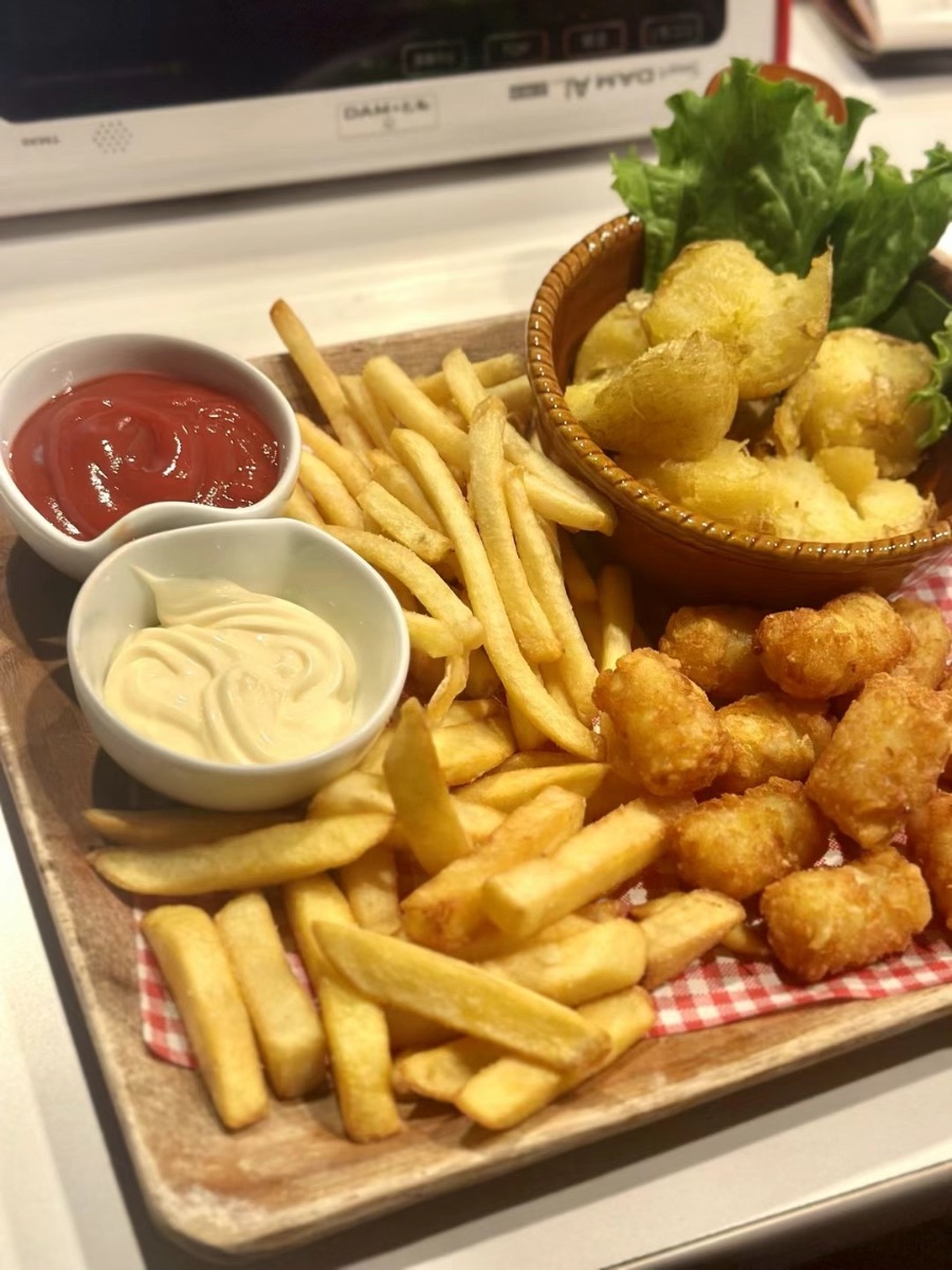 这张图片展示了一份丰富的炸物拼盘。木制托盘上铺着红白格子纸,摆放着多种炸制食品:有粗细不同的薯条,金黄酥脆;还有炸薯球,外脆里嫩;以及带皮炸土豆块,旁边点缀着新鲜生菜。托盘左侧有两个白色小碟,分别装着红色的番茄酱和淡黄色的蛋黄酱,为这些炸物提供了多样的蘸料选择。背景中还能看到一台白色的电器,整体画面给人一种美味诱人、充满食欲的感觉,是一份适合分享的休闲美食组合。