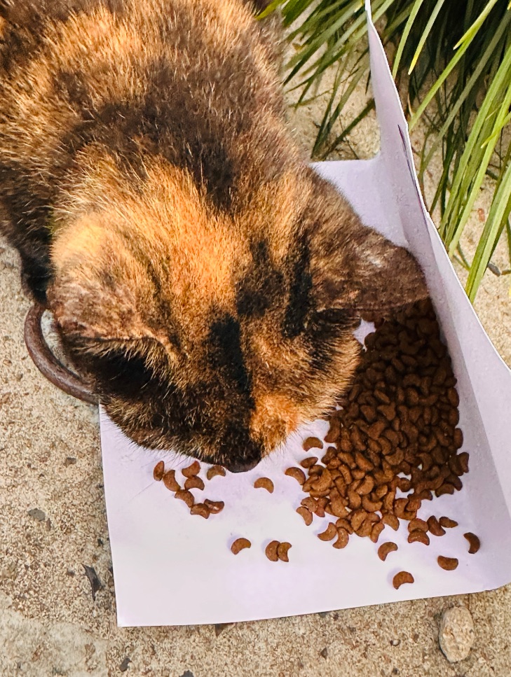 一只毛色斑斓的玳瑁猫,正专注地低头享用着我为它准备的猫粮。那些棕褐色的猫粮颗粒盛在简易的白色纸托里,猫咪吃得格外投入,毛茸茸的脑袋几乎整个埋进食物中,每一根胡须都透着满足。它脖颈间似乎还戴着一个不起眼的项圈,却难掩流浪的痕迹。