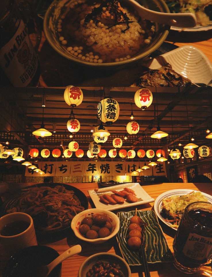 暖黄的灯光下,日式灯笼与招牌将店内装点得格外有氛围,“御祭禮”“祭”等字样的灯笼错落悬挂,仿佛把日本街头的居酒屋风情搬到了眼前。餐桌上摆满了各式日料:一碗泡饭上面铺着海苔丝,米香混着汤汁的鲜味很是诱人;还有炒面、串烧丸子、酱菜小碟,旁边的Jim Beam威士忌又添了几分微醺的惬意。每一道料理都精致入味,在这样的环境里用餐,仿佛瞬间穿越到了东京的小巷居酒屋,味蕾与视觉都沉浸在浓浓的日式风情里,每一口都是对美食与氛围的双重享受。