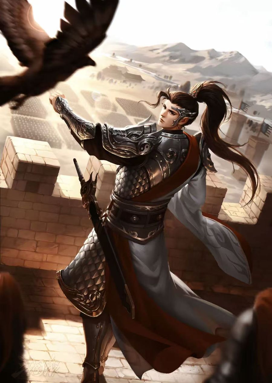 早年的姜维本是魏国中郎,诸葛亮第一次北伐时,他因被怀疑通敌而不得已归蜀。这位兼具勇力与智谋的将才,很快成为诸葛亮的衣钵传人,临终前被授以"继绝兴微"的重任。此后二十九年,他以九伐中原的执着,践行着对武侯的承诺——画中那只盘旋的苍鹰,恰似他六出祁山、鏖战陇西的孤勇身影。