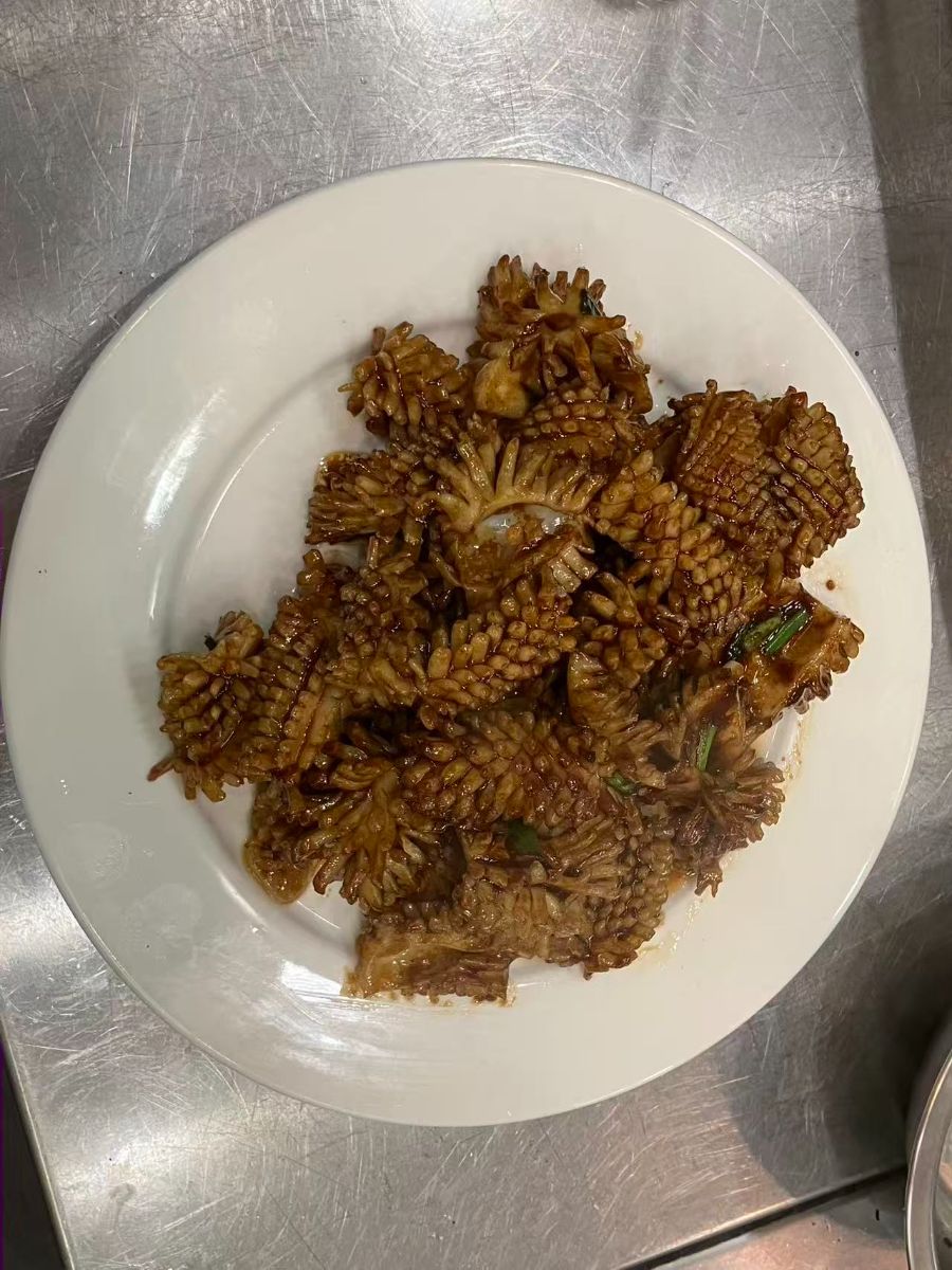 3. 热锅冷油爆香姜蒜末,下海鲜酱+甜面酱(1:1)炒出红油,放入青红椒、洋葱断生,再倒墨鱼卷,大火快炒,烹料酒、生抽、少许糖提鲜,勾薄芡淋香油即可。