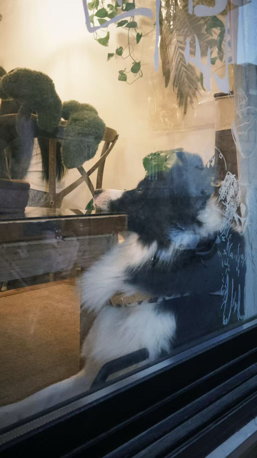 昏黄暖光裹着玻璃窗,像给世界蒙了层软乎乎的糖纸。窗边那只边牧把前爪搭在木质台沿,黑白绒毛蹭着冰凉的玻璃,鼻尖贴上去时,玻璃泛起细微波纹——它正偏头望向外头,黑亮的眼睛里盛着半盏好奇,半盏安静。身后的椅子上蜷着只圆滚滚的“毛球”,蓬松的绿毛团成云朵模样,和墙沿垂下来的绿萝叶子缠在一处,成了温柔的背景。玻璃上还留着歪歪扭扭的白色涂鸦,像谁随手画的小絮语,刚好落在小狗耳尖旁,倒添了点孩子气的热闹。暖光揉碎在它的毛梢上,连带着木质家具的纹路都软下来。这一刻像被按了慢放键,连空气里都飘着松弛的甜,连窗外的风路过,都轻手轻脚的。