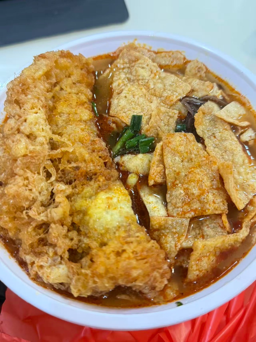 刚掀盒盖,那股勾人的“臭”就裹着热乎气扑过来——是炸腐竹浸软后裹满红油的香,是酸笋藏在汤底里的鲜爽。大片炸蛋吸饱了螺蛳汤,咬开时油香混着辣意顺着嘴角淌,脆韧的木耳裹着汤底的咸鲜,连葱花都浸得润润的。软滑的米粉缠在筷子上,裹满红亮的汤汁送进嘴里,“臭”与“香”在舌尖炸开,是越吃越上头的瘾。管它旁人说这味道“刁钻”,此刻捧着这碗热乎,让红油沾在指尖、让香气裹满鼻腔,就是烟火里最放肆的快乐,连盒底剩的汤汁都想再嗦一口。