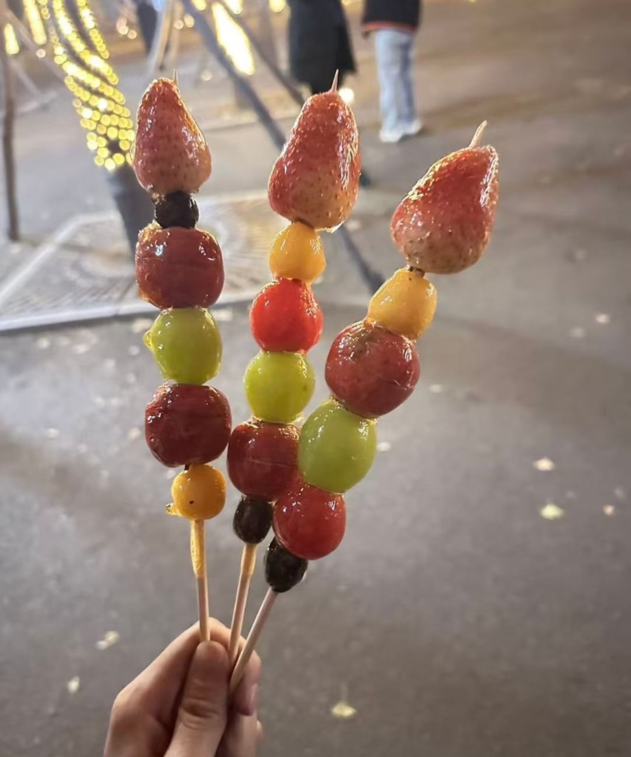 攥着三根糖葫芦站在路灯下,糖壳裹着的草莓像颗小灯笼,下面串着山楂、青提与橘子瓣,暖黄的灯光一照,糖衣泛着亮晶晶的光,连糖丝都缠得软乎乎的。咬一口,脆壳“咔嚓”裂开,甜香先裹住舌头,紧接着是草莓的软嫩汁水,混着山楂的酸、青提的脆、橘子瓣的清甜,几种味道裹在一起往喉咙里钻。晚风裹着落叶擦过裤脚,可手里的糖葫芦攥得暖乎乎的,糖渍沾在指尖都舍不得擦,连路过的行人都带着被甜软裹住的笑意——冬夜的冷意好像都被这串甜融化了,原来最踏实的快乐,不过是街头攥着的这捧“甜得刚好”。
