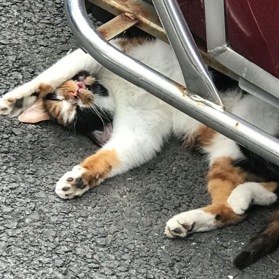 在车辆的金属构件下,一只三花猫正享受着慵懒的午后。它四脚伸展,肚皮朝上,露出粉嫩的舌头,模样惬意十足。黑白棕相间的毛发在阳光下泛着柔和的光泽,周围的沥青路面与车辆部件,都成了它的 “休憩港湾”。这是街头的治愈小景,猫咪用最放松的姿态,在车下躲避阳光,享受片刻的宁静。过往的行人或许会被它的可爱姿态吸引,停下脚步,看着它无忧无虑地酣睡,仿佛所有的烦恼都在这只猫咪的慵懒中消散,为这平凡的街头增添了一抹温暖的萌趣。