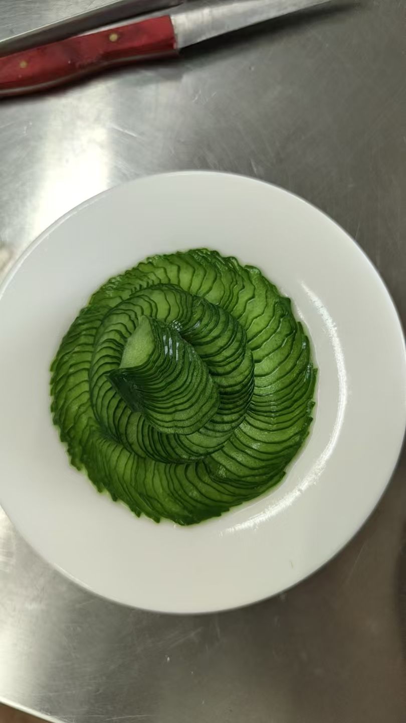 盘形黄瓜是用新鲜黄瓜制作的创意摆盘,无需复杂工具,凭借切法和造型让普通黄瓜变身餐宴“颜值担当”,常见于凉菜、热菜点缀或刺身、寿司的配菜。