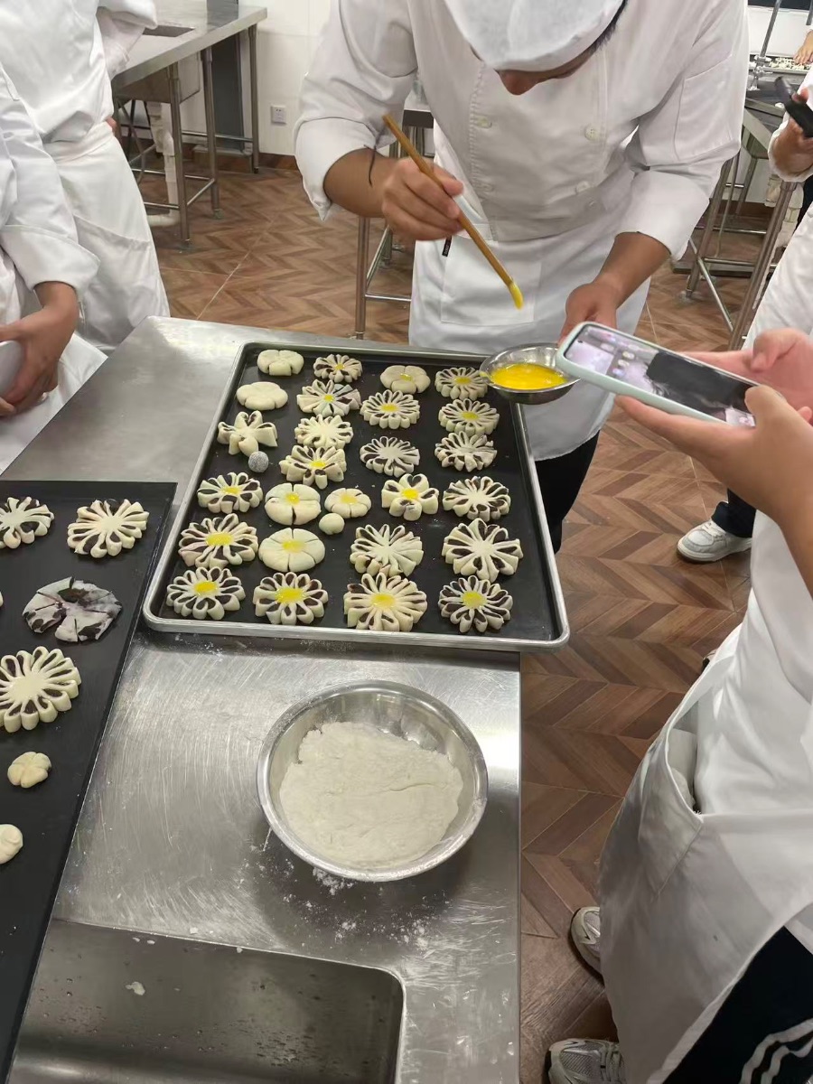 穿白色工服的老师正捏着细毛刷,小心往面点中心刷一层金黄的蛋液——这会让烤好的点心更亮更好看。旁边有人举着手机,凑近记录这有意思的一步,其他人也围着操作台,眼睛都落在那些精致的面点上。