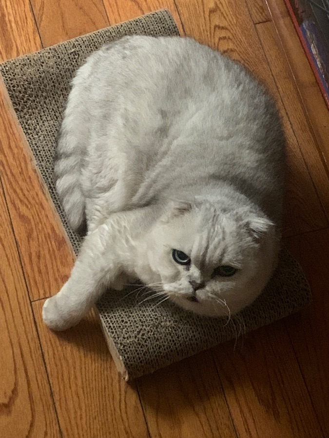 一只银渐层英短猫,正蜷卧在瓦楞纸猫抓板上。它的毛发蓬松柔软,整体呈浅银灰色,毛尖带有细微的深色纹理,衬得毛色更显层次。猫咪的体型圆胖,几乎占满了猫抓板的表面,一只前爪随意搭在抓板边缘,姿态慵懒松弛。