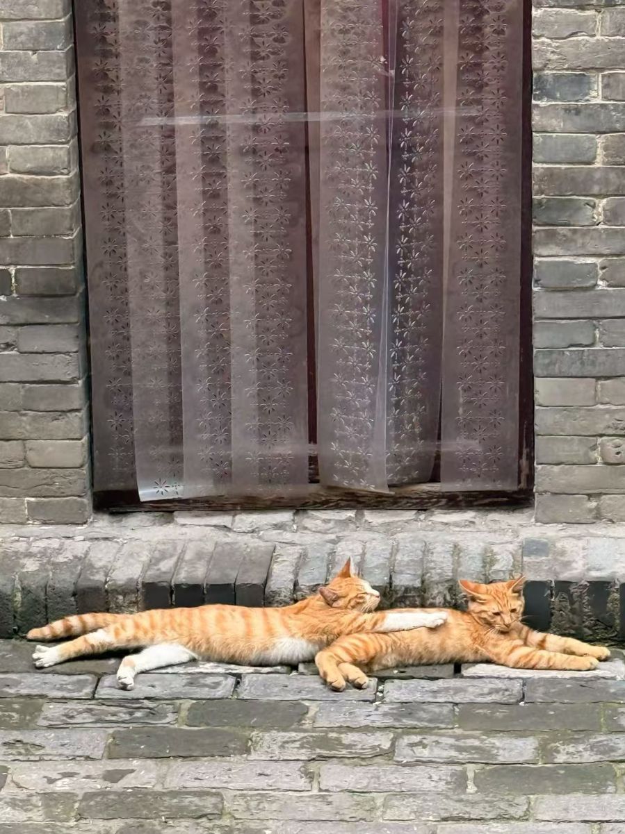 老砖墙被岁月磨得发灰,窗上的纱帘垂着细碎的花纹,像蒙了一层旧时光的雾。窗下的青石板被晒得暖烘烘的,两只橘猫把自己铺成了两条毛茸茸的“毯子”,顺着石缝的弧度,把身子抻得又长又软。左边那只的白爪子搭在同伴背上,尾巴尖懒洋洋地勾着石缝,耳朵尖被阳光晒得发粉,像是在梦里还惦记着给身边的家伙顺毛。右边那只眯着眼,胡须都懒得动,脊背随着呼吸轻轻起伏,橘色的毛被风掀起细绒,沾着点砖缝里的碎尘。风从巷口溜过来,带着老木头和青苔的气息,擦过它们的尾巴,两只猫却只把脑袋往对方身边又蹭了蹭——像是要把这满是暖意的午后,都揉进彼此软乎乎的毛里。窗里的纱帘轻轻晃了晃,漏进来的光在它们身上淌成一小片温柔的金,连砖缝里的杂草都跟着安静下来,怕扰了这摊在时光里的、懒洋洋的亲昵。