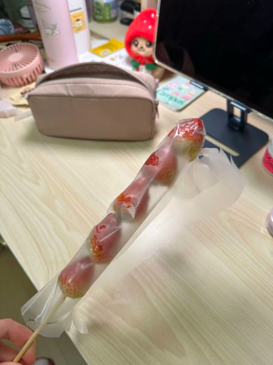 拆开透明包装的时候,糖壳还带着点脆生生的凉,我举着竹签转了转,草莓的果肉在糖衣里透着粉粉的红,像把一小串春天的晚霞攥在了手里。咬下第一口时,糖壳在齿间碎成细细的脆响,接着是草莓的酸甜涌上来,带着点冰过的凉,刚好中和了糖的甜腻。想起小时候攥着零花钱在路边买糖葫芦,总要踮着脚看老板裹糖,糖丝在风里拉得长长的,落在山楂上结成亮晶晶的壳。现在自己买给自己,还是会忍不住像个小孩一样,举着它在房间里晃一圈,让阳光把糖衣照得闪闪发亮,连空气里都飘着甜丝丝的味道,好像这样就能把日子也裹上一层亮晶晶的糖。