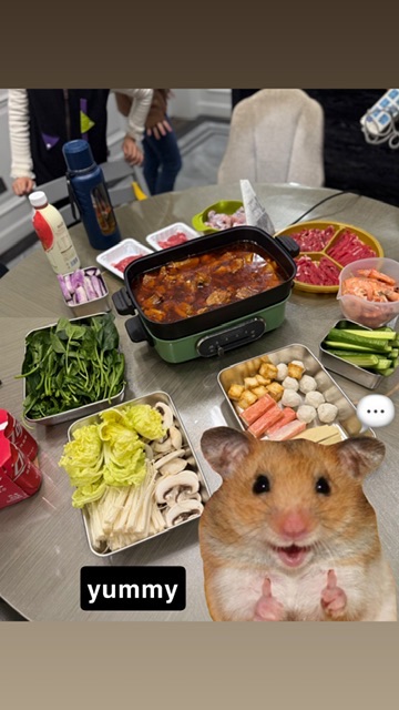 桌边的保温杯、饮料瓶透着生活的温馨,背景里隐约的人影让这顿火锅多了几分相聚的热闹。伸手夹起一筷子肉片放进汤底,看着它在红汤里翻滚变色,再捞出来裹上蘸料,肉的鲜嫩混着汤底的麻辣在嘴里爆开。咬一口脆生生的黄瓜条解腻,再涮上一把菠菜,清甜的蔬菜中和了辣味,每一口都是舌尖的满足。小仓鼠“yummy”的标注仿佛说出了心声,这样一桌热气腾腾的火锅,把平凡日子里的快乐,煮得滚烫又香甜。