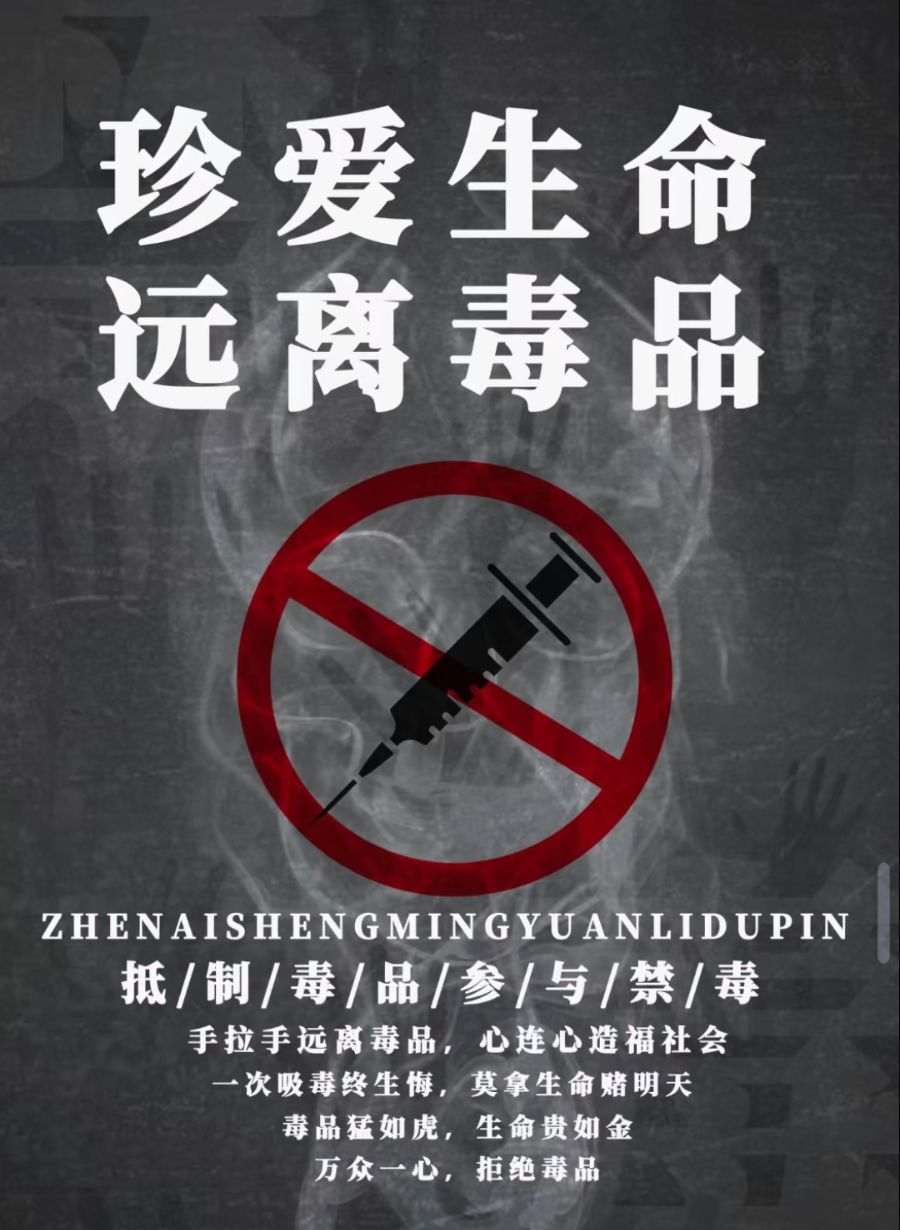 • 珍爱生命,远离毒品!   毒品,是潜藏在人间的致命幽灵,它披着形形色色的伪装,一步步吞噬着无数人的青春、家庭与未来。它可能是看似炫酷的“跳跳糖”,可能是伪装成奶茶的粉末,也可能是声称能缓解压力的“小邮票”。一旦沾染,便如同被毒蛇缠绕,生理上的依赖会让人饱受戒断反应的折磨,精神上的沉沦会让人变得麻木颓废。原本意气风发的少年,会因毒品变得形容枯槁;原本幸福美满的家庭,会因毒品支离破碎;原本充满希望的人生,会因毒品坠入无底深渊。毒品不仅摧残个人身心,更会滋生盗窃、抢劫等违法犯罪行为,扰乱社会秩序,危害国家安全。“防毒反毒,人人有责”。作为新时代的青年,我们要擦亮双眼,认清毒品的狰狞面目,主动学习禁毒知识,坚决抵制不良诱惑。发现涉毒线索,及时向公安机关举报。生命只有一次,青春不可重来。让我们携手筑牢禁毒防线,守护自己与家人的幸福,共筑无毒的美好家园!