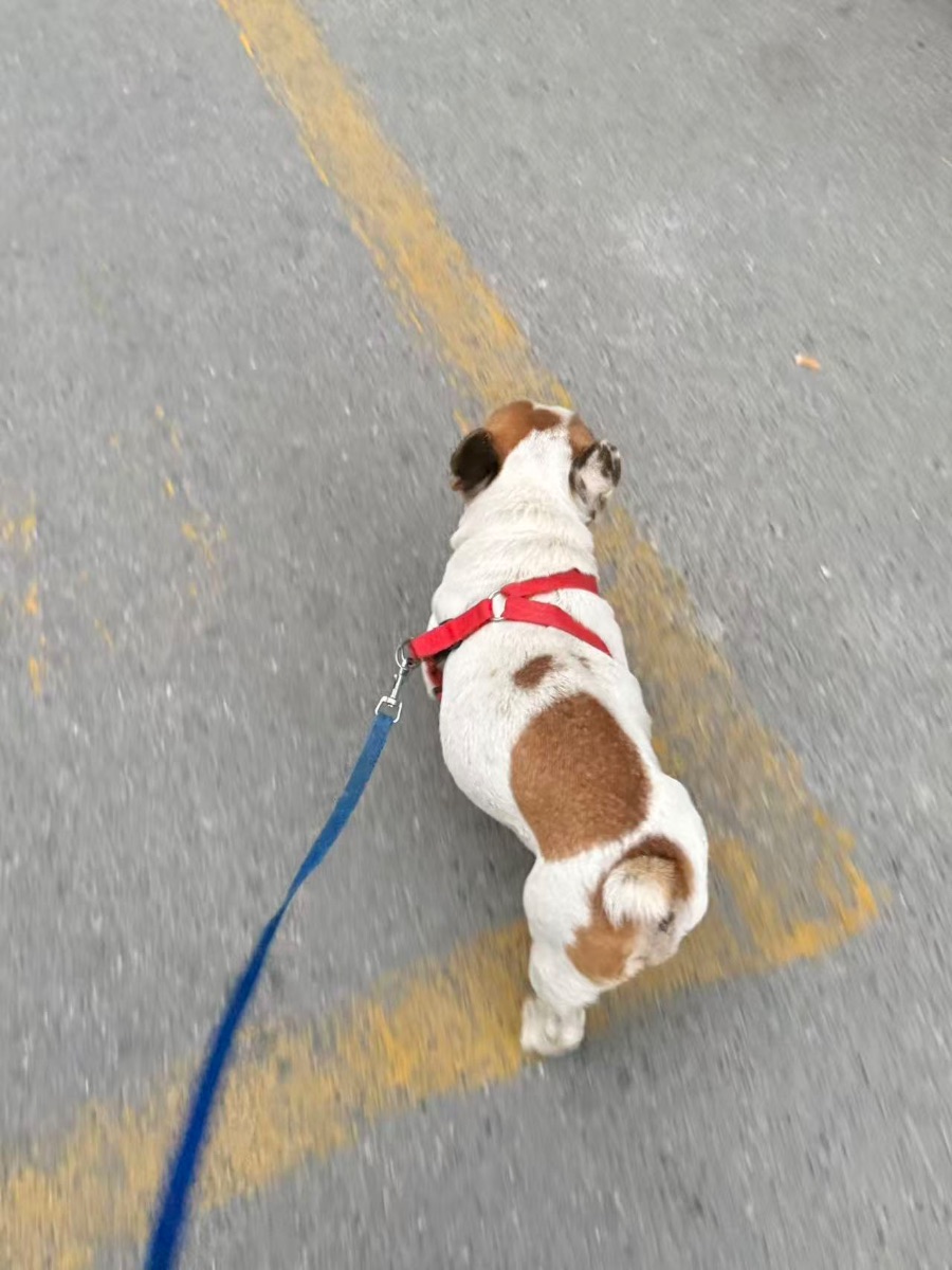 牵着小狗走在小区的柏油路上,它迈着小短腿哒哒地往前挪,红背带配蓝牵引绳,在黄色的标线旁晃出俏皮的弧度。小家伙总被路边的气味勾着,一会儿凑到草丛边嗅嗅,一会儿停在路沿石旁东张西望,完全不顾我跟在后面的步伐。冬日的风掠过,带着小区里樟树的清香,看着它圆滚滚的身子扭来扭去,尾巴轻轻扫着地面,心里的烦躁也跟着散了。不用赶时间,不用想琐事,就跟着这只小毛球的节奏,一步一步踩在阳光漏下的光斑里,原来平淡的小区散步,也藏着这样简单的治愈。