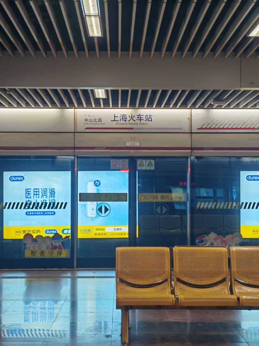 赶到上海火车站地铁站时,站厅里的灯光亮得晃眼,金属质感的屏蔽门映着杜蕾斯的广告海报,米黄色的座椅空落落的,只有轨道旁的指示灯偶尔闪一下光。平日里熙攘的地铁站此刻格外安静,鞋底敲在光洁的地面上,回声在空旷的空间里荡开。整理好志愿者的证件和物料,看着“上海火车站”的标识牌,想到接下来要为往来的乘客提供帮助,原本的疲惫也被一股莫名的干劲取代,只等第一班地铁驶来,开启这一天的志愿工作。