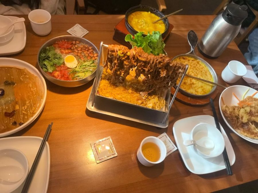旁边的石锅蛋羹还在咕嘟咕嘟冒着泡,嫩黄的蛋液凝得滑嫩,用勺子轻轻一舀,就能盛起满满的一碗,入口是蛋香混着淡淡的奶香,温润得熨帖肠胃。凉拌菜摆在一旁,红绿相间的黄瓜丝、番茄块配着花生碎,淋上酸甜的酱汁,嚼起来清爽解腻,刚好中和了炸物的油润。还有那碗晶莹的粉丝煲,吸饱了浓稠的汤汁,软糯中带着弹牙的口感,鲜美的滋味在舌尖绕了一圈,让人忍不住一口接一口。