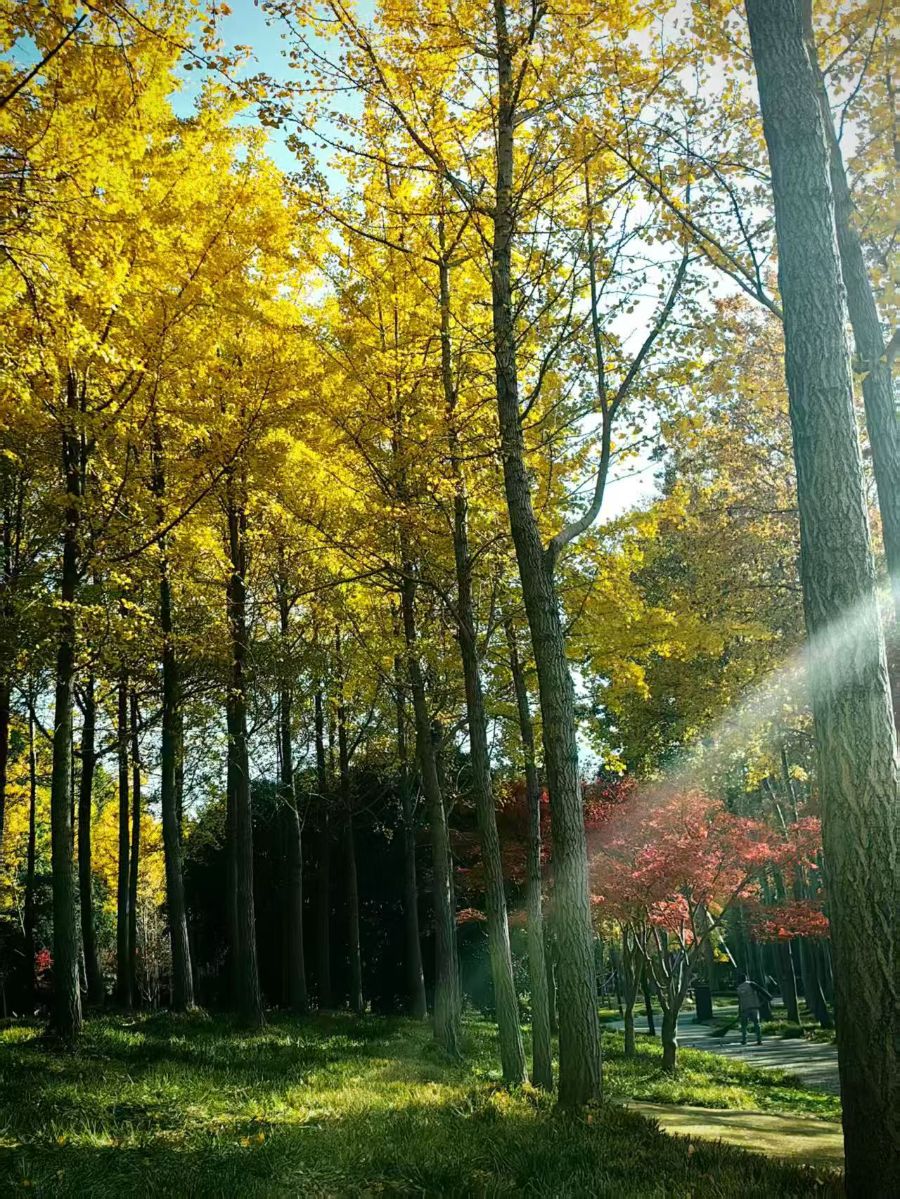 惊艳了。满树的叶子像被阳光染透的金箔,层层叠叠挂在枝头,风一吹,金叶子就轻轻摇晃,洒下细碎的光斑。阳光穿过树干的缝隙,在草地上投出长长的光影,旁边还藏着几株红枫,艳红的叶子和金黄的银杏撞在一起,像一幅打翻了颜料的画。