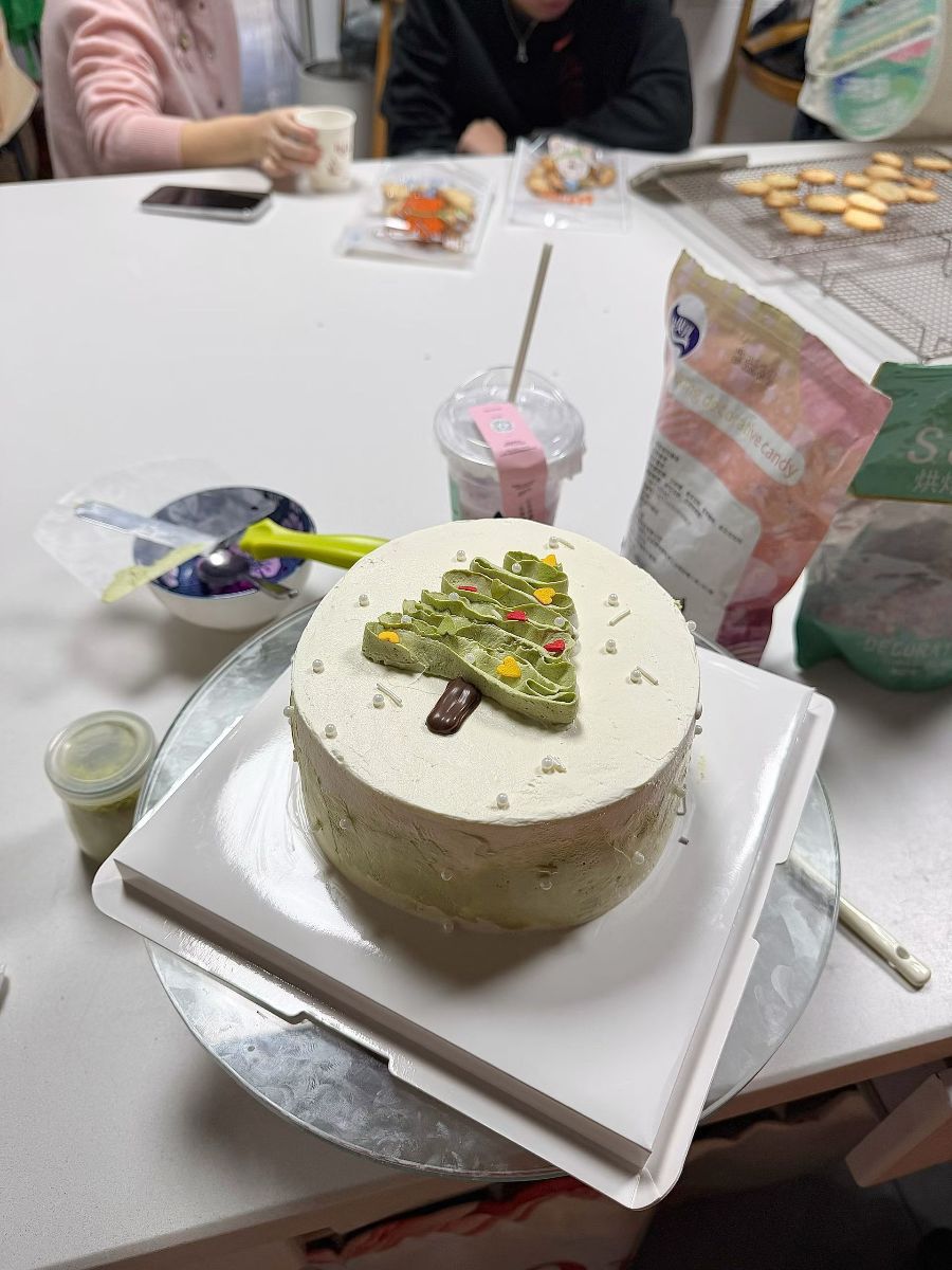蛋糕放在白色方形底托与银色转台上,背景是摆满烘焙工具和食材的桌面,塑料杯、烘焙原料袋与烤盘里的饼干错落摆放,还有模糊的人物身影,透着温馨的烘焙工作室氛围,更显这款手工蛋糕的珍贵。抹茶奶油的清苦中和了蛋糕的甜腻,绵软的糕体搭配丝滑的奶油,光是看着就能想象到入口的美妙口感。这份带着圣诞气息的抹茶蛋糕,不仅是味觉的享受,更是手工烘焙里藏着的温柔心意,让平凡的烘焙时刻,多了份甜甜的仪式