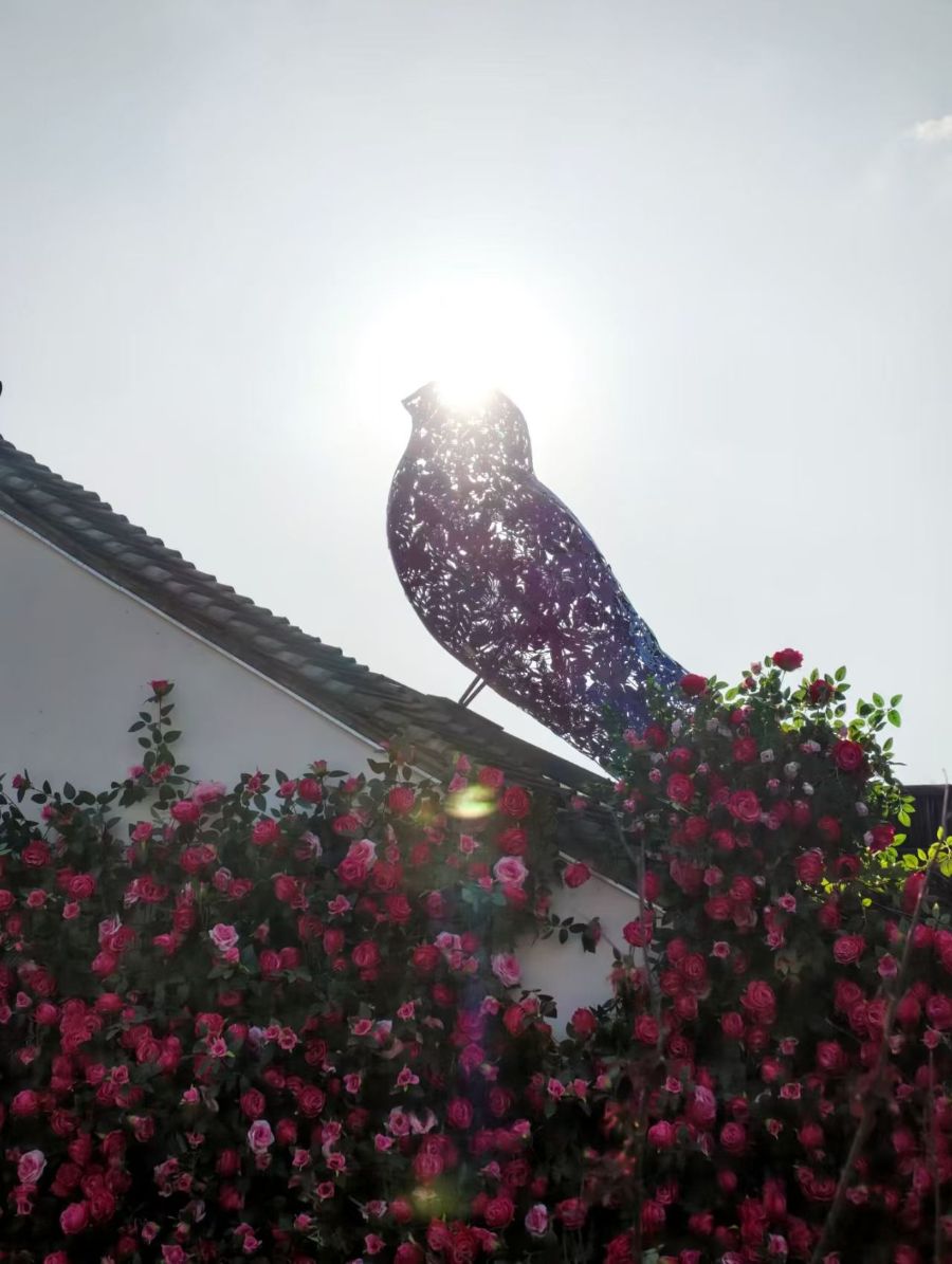 旁边的白墙黑瓦透着江南的韵味,和这丛花、这只“鸟”凑在一起,像一幅精致的水墨画。我凑近看,雕塑的羽毛纹路刻得细细的,风一吹,花丛轻轻晃动,竟让人觉得这只“鸟”好像要振翅飞走。