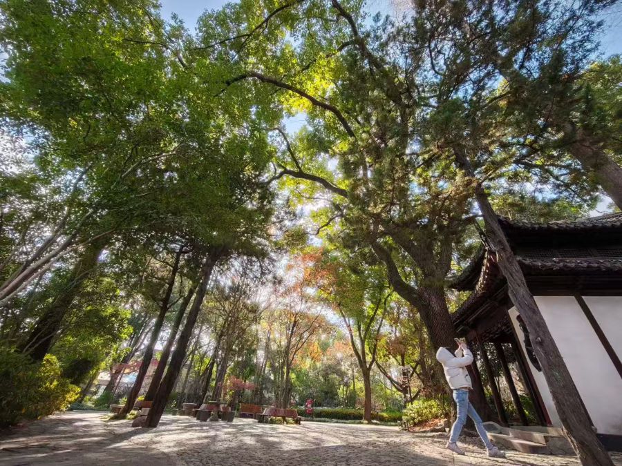 穿白外套的女孩站在亭边举着手机拍照,身影在绿影里格外亮眼,她微微踮脚的模样,像要把这满林的晴光都收进镜头里。我踩着光斑慢慢走,听着树叶的沙沙声,阳光透过叶缝落在肩头,暖融融的,连呼吸里都裹着草木的清香。