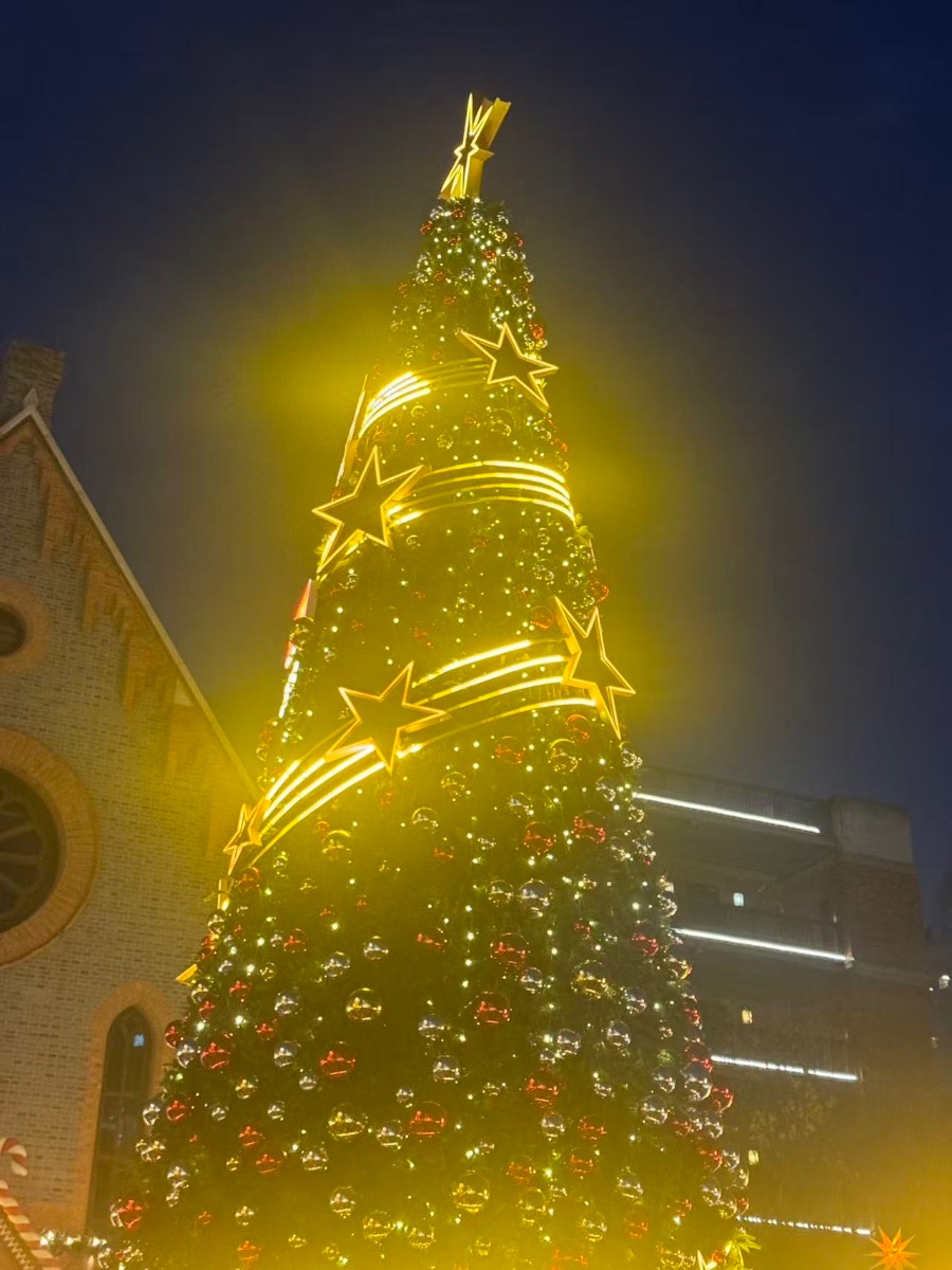 暖黄的光晕从树身向四周漫开,将周遭的空气晕染得温柔又朦胧。左侧砖石建筑的复古纹路清晰可见,红棕色的砖边与圆形花窗勾勒出欧式建筑的典雅,冷硬的建筑线条与圣诞树的柔美光影形成鲜明对比。远处现代楼宇的冷白灯带若隐若现,古今建筑的碰撞,让这棵圣诞树的节日氛围更添层次,夜色里的光影交织,酿出