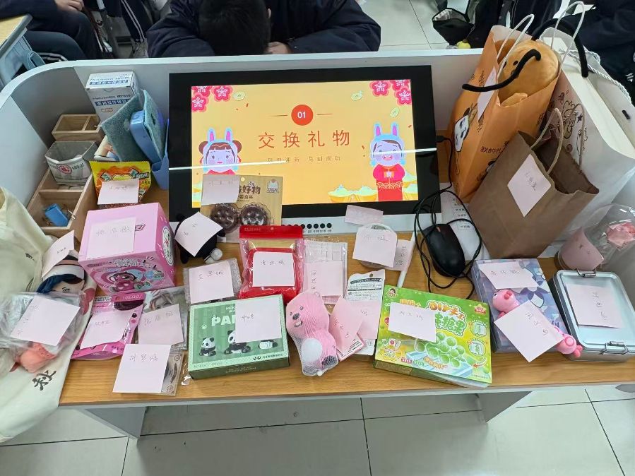 桌面被琳琅满目的礼物堆得满满当当,屏幕上“交换礼物”的字样格外醒目,这场充满暖意的迎新环节,成了校园里最甜的风景。