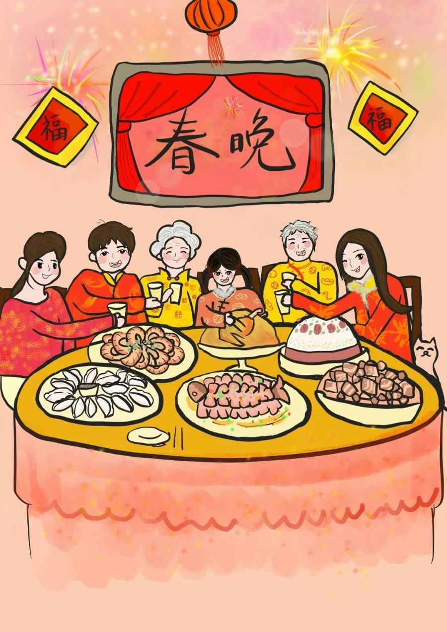 • 除夕:守岁、吃年夜饭:全家老小欢聚一堂,吃年夜饭,这顿饭十分丰盛,鸡鸭鱼肉等应有尽有。吃完年夜饭,大家会一起守岁,通宵不眠,迎接新年的到来。长辈还会给晚辈发压岁钱,寓意压住邪祟,保佑晚辈平安度过一岁。
