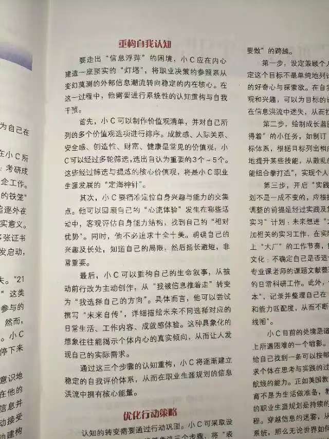 自我认知是职业生涯规划的核心基石,而我们常常困在“信息浮萍”的状态中随波逐流。文中的三个步骤给了我清晰的指引:先梳理价值观,筛选出职业发展的“定海神针”;再精准定位兴趣与能力的交集,找到自己的“相对优势”;最后用“未来自传”重构生命叙事,从被动跟风转向主动创造。这让我明白,稳定的自我评价体系,不是从外界的标准中寻找,而是从内心的探索中建立。当我们能清晰回答“我要做什么”,就能在信息洪流中拥有核心能量,让职业规划不再是照搬模板,而是一场忠于自我的创作。