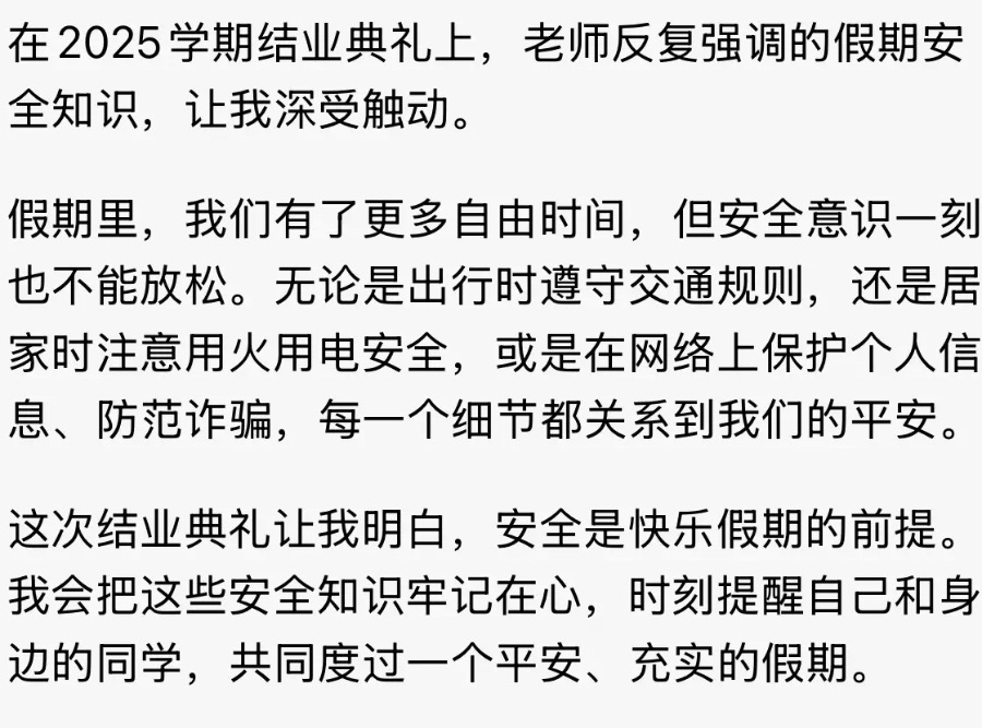 在2025学期结业典礼上,老师反复强调的假期安全知识,让我深受触动。假期里,我们有了更多自由时间,但安全意识一刻也不能放松。无论是出行时遵守交通规则,还是居家时注意用火用电安全,或是在网络上保护个人信息、防范诈骗,每一个细节都关系到我们的平安。这次结业典礼让我明白,安全是快乐假期的前提。我会把这些安全知识牢记在心,时刻提醒自己和身边的同学,共同度过一个平安、充实的假期。
