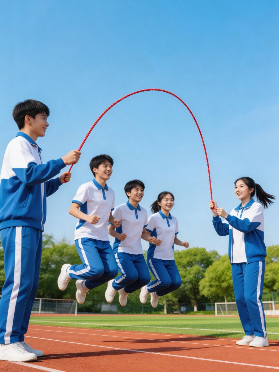 操场边的树叶沙沙作响,阳光透过枝叶的缝隙,在红白相间的长绳上投下细碎的金斑。小宇双手攥紧绳柄,手腕轻轻一抖,绳子便像苏醒的银蛇般在空中画起圆弧。