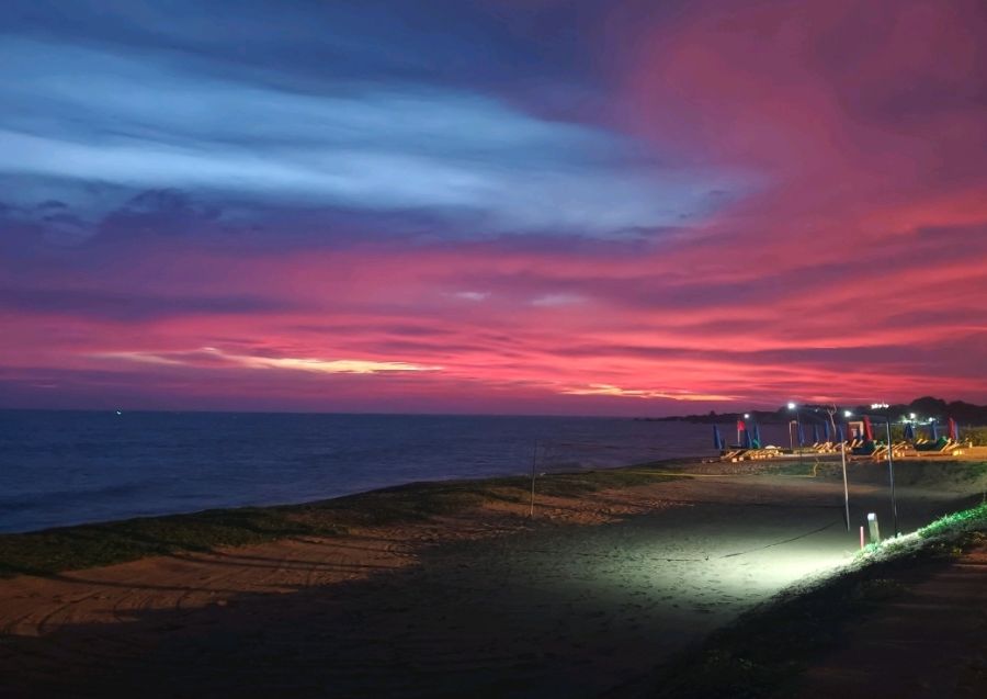 黄昏时分,海边的天空被晚霞晕染成极致浪漫的模样,粉紫、橙红与深邃的蓝在天际层层交融,像上帝打翻的调色盘,铺陈在无垠的海面上。海浪温柔地拍打着沙滩,白日的喧嚣渐渐褪去,只剩晚风轻拂的宁静。岸边的路灯次第亮起,暖黄的光洒在空荡的沙滩与躺椅上,为这片暮色添了几分人间烟火气。远处的海平面与天际线相融,晚霞一点点沉落,把白日的疲惫都揉进温柔的海风里。沙滩上的车辙印、远处的灯塔微光、摇曳的遮阳伞,都在暮色里变得柔和。这是海边最治愈的时刻,在落日与晚风里,与自己和解,享受独属于大海的、慢下来的时光,让所有情绪都被这片温柔的暮色彻底治愈。