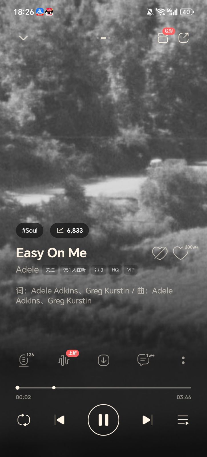 这是一张音乐播放软件的截图,正在播放英国歌手Adele的经典灵魂乐作品《Easy On Me》。界面采用黑灰渐变的沉浸式设计,背景是朦胧的黑白郊野风景,契合歌曲舒缓深情的氛围。顶部显示时间18:26、5G网络等状态栏信息,中间标注歌曲名、歌手名,以及#Soul标签、6833的热度值,还有951人在听的实时数据,词曲作者为Adele Adkins与Greg Kurstin。底部是完整的播放控制栏,进度条显示歌曲播放至00:02,总时长03:44,循环、切歌、暂停、播放列表等功能按钮清晰,评论区1w+、收藏200w+的数据,凸显了这首全球爆款单曲的超高人气。