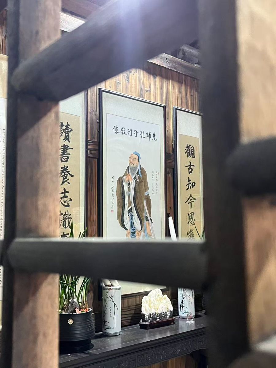 透过古朴的木质窗棂望去,室内尽显浓郁的中式书香气息。深褐色的木质墙板纹理清晰,正中悬挂着一幅“先师孔子行教像”,画中孔子身着长袍,神态儒雅,两侧配有“觀古知今思”“讀書養志識”的书法条幅,笔墨苍劲,意蕴深远。下方的深色案几上,摆放着雅致的盆栽、绘有墨竹的瓷瓶与温润的玉石摆件,错落有致。古朴的木格窗棂作为前景,线条简洁,为画面增添了层次感与朦胧美。整体空间古色古香,陈设典雅,笔墨丹青与器物陈设相得益彰,营造出静谧肃穆、充满文化底蕴的氛围,仿佛置身于传统书院之中,尽显中式美学的庄重与雅致。