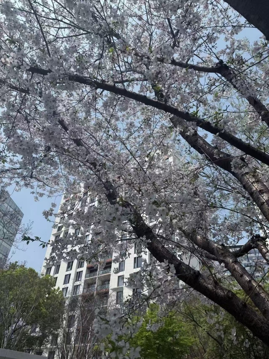 楼宇旁,新绿的树木蓬勃生长,深浅不一的绿意与樱花的粉白撞出满目的生机,澄澈的蓝天没有一丝杂色,衬得满树繁花愈发明媚动人。镜头以仰拍的视角,将春日的浪漫与都市的烟火气完美融合,抬头撞见的满树樱花