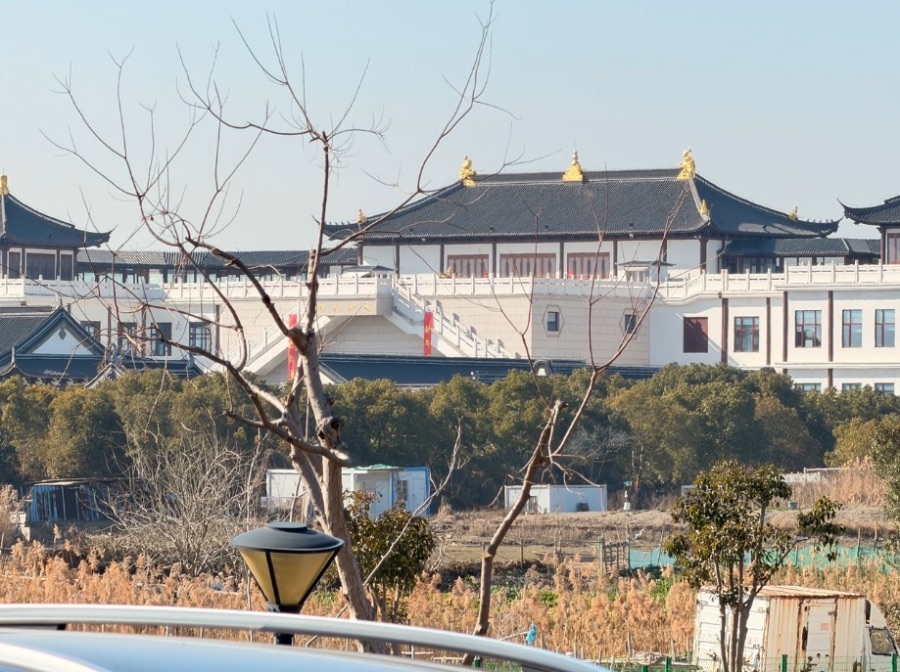 枯枝为框,晴空作幕,白墙黛瓦的殿宇静立在视野尽头,金顶在阳光下泛着温润的光,飞檐翘角间尽是江南古建的雅致。高台之上的殿宇,隔着一片草木与旷野,少了寺内的烟火,多了几分遗世独立的禅意。
