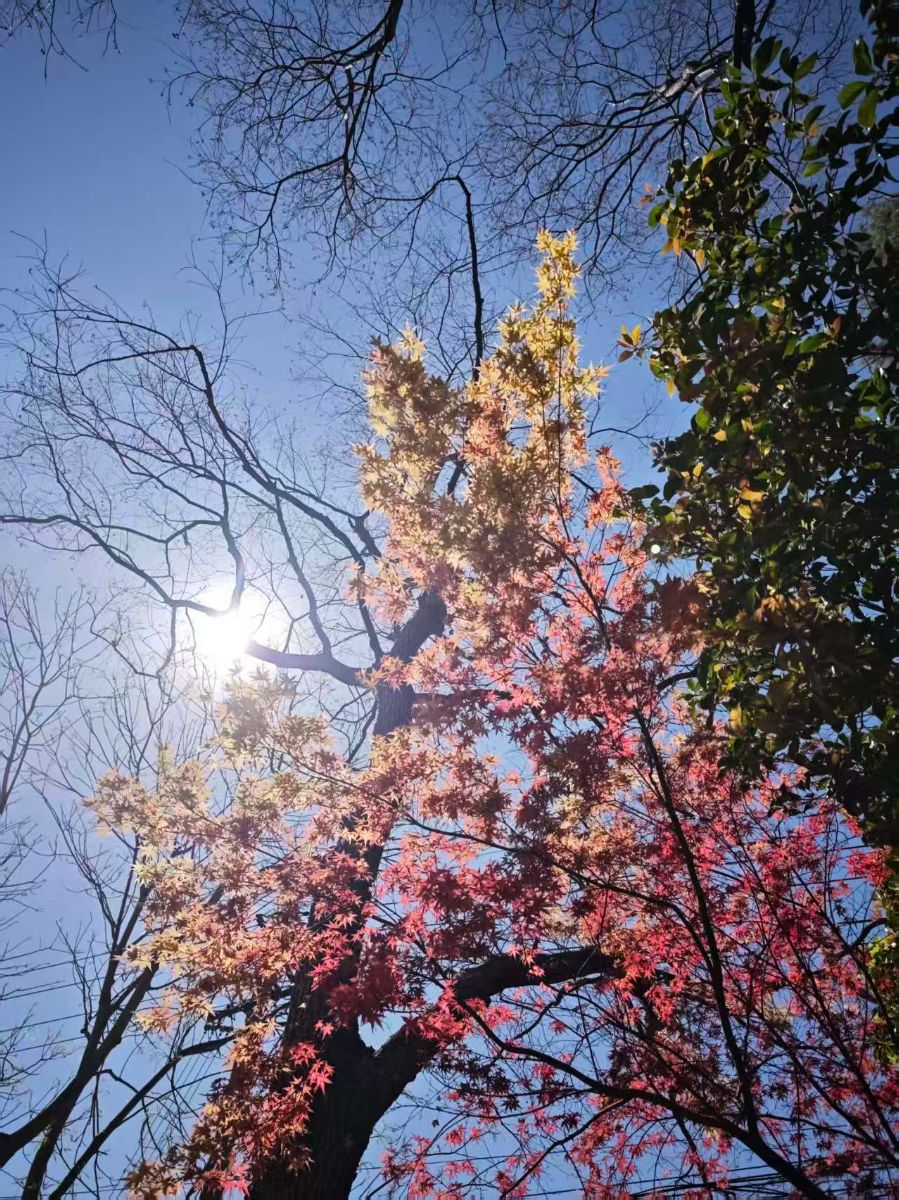 抬头的瞬间,就被这棵枫树狠狠惊艳到。阳光穿过层层叠叠的枝叶,在红枫上跳着舞,蓝天为幕,光影为笔,把一棵树画成了最动人的风景。