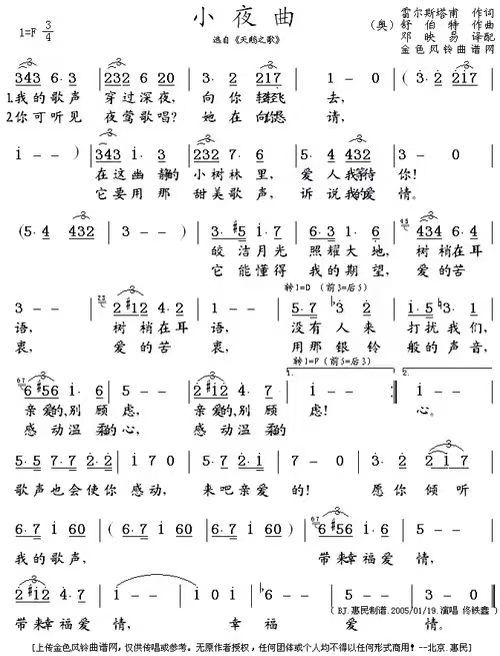 全曲3/4拍,二部曲式,d小调与d大调交替,钢琴先以分解和弦模仿吉他/琉特琴,营造深夜静谧氛围 。第一段旋律轻柔婉转,“我的歌声穿过深夜,向你轻轻飞去”,满是温柔的恳求与期待。中段转入大调,附点与三连音推动情绪,从内敛倾诉转为炽热告白,形成高潮 。尾声渐弱,如月光下的低语,余韵悠长。