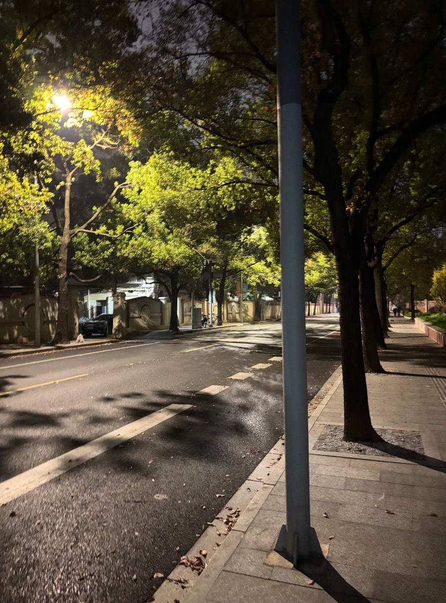 我走在人行道上,听着自己的脚步声和风吹树叶的沙沙声,心里满是安稳。这样的深夜街道,没有了人群的喧闹,却藏着最治愈的温柔,让人心头的焦躁慢慢消散,只余下平静与松弛。