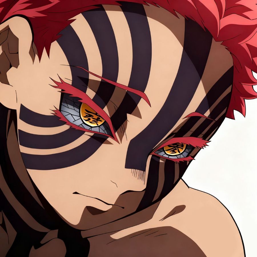 变成鬼后的猗窝座,外貌极具辨识度:桃红色短发、金色瞳眸,惨白的皮肤布满深蓝色刺青,指甲血红,身着紫红色短衫,脚腕挂着念珠 。他是纯粹的武痴,一生痴迷战斗,只追求与强者正面交锋,绝不偷袭、不使阴招,对弱者不屑一顾,却始终坚守着武者的底线。更特别的是,他从不吃女人,这份潜意识里的坚守,正是残存的人性在思念着恋雪