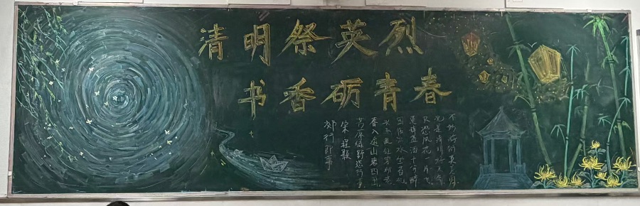 这幅黑板报以“清明祭英烈,书香砺青春”为主题,整体设计清雅庄重,意境悠远。