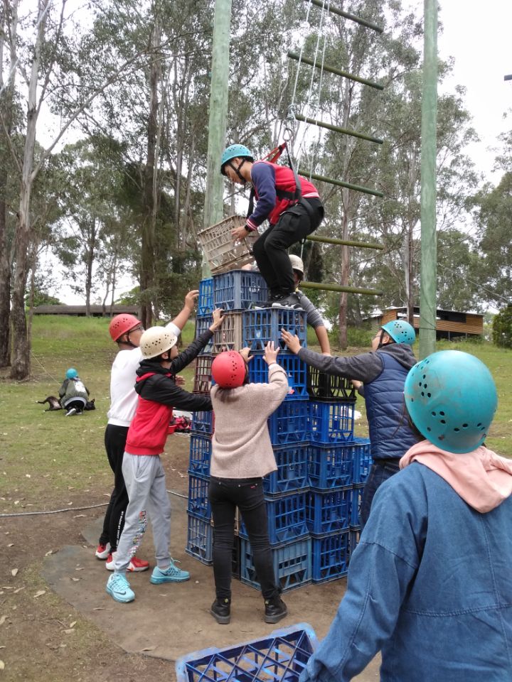 这是野营的第一项活动,堆箱登高。活动规则是每次选出两人系好安全带,作为攀登者,踩在伙伴们搭好的箱子上慢慢向上爬。按最终踩到的最高的箱子层数算作最终得分,限时10分钟。