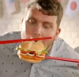 视频中,“顾客”手握尺寸夸张的巨筷,试图尝试用这巨筷吃掉汉堡,动作显得十分笨拙吃力。