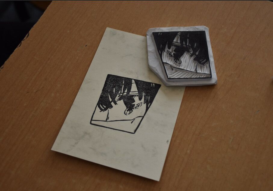 当我坐下来以后,来了一位制章社的同学站到我的旁边来。她向我递过来了一块橡皮砖和一把长的像笔一样的小刀,她告诉我这把刀就叫笔刀。接着她又递过来一些用油墨打印在A4纸上的图案,她叫我挑选个素材来制作橡皮章,这些图案有文字也有动漫人物或者是一些卡通画。当然,作为新手我选择了一个简单的图案,“猫”字来作为我刻章的素材。
