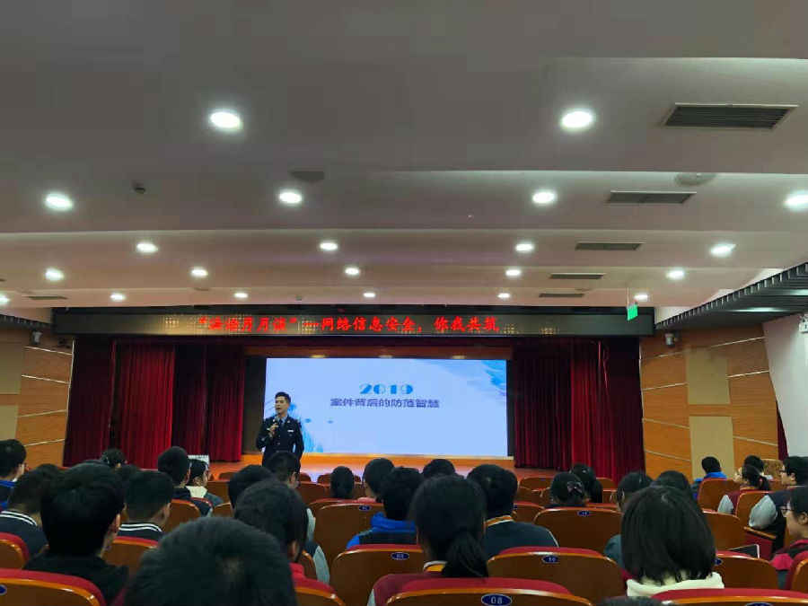 首先黄警官幽默的开启了本次讲座的主题,网络安全。现如今,随之科技的不断进步,计算机在社会生活各个领域广泛运用,人们对计算机时刻需求,办公娱乐都离不开它。网络已成为一个无处不在、无所不用的工具。然而,网络安全问题也越来越突出,目前很多不法分子利用网络手段实行诈骗,骗取他人钱财。由于计算机网络联接形式的多样性等因素,致使我们的计算机网络容易遭受病毒和其它不轨行为的攻击。这样一来它将会严重的影响我们的生活。黄奕警官通过理论联系实际的方式,以法论事,告诫同学们要增强法制观念,提高法律意识,同时也希望同学们在生活中做到不轻信,遇到类似诈骗要冷静处理,更好地保护自己的安全。