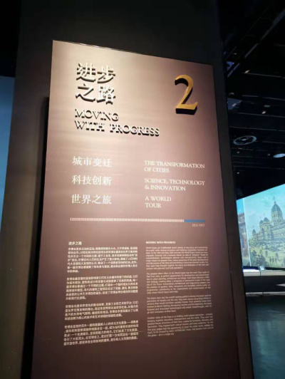 上楼,来到二号展厅“进步之路”,主要介绍了城市变迁、科技创兴和“世界之旅”。主要详细介绍了五次不同城市的世博会——1873年维也纳、1880年墨尔本、1893年芝加哥、1910年布鲁塞尔和1915年旧金山。同样的,在这几年的期间里,也有科技的创新,比如1888年的巴塞罗那世博会展出了白炽灯,在后来1911年白炽灯成为家庭和城市的标准光源,再比如1904年圣路易斯世博会展出的莱特兄弟飞机,这何不是经典。