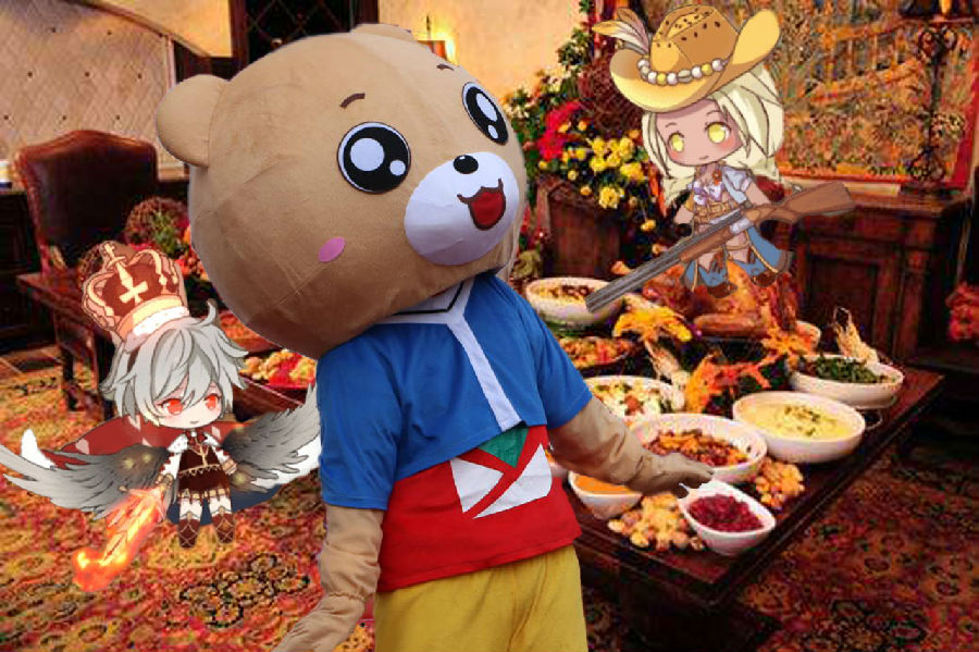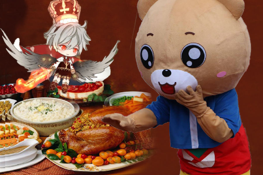 “熊熊熊!来体验一下感恩节的游戏吧!”玉米面包拉着熊熊熊来到一个较为偏僻长桌子边上,上面已经放了一些碗,里面是一些秸秆之类的东西,边上一个黑裙子的Q版小人在布置针线,身边还跟着一个白色的可爱的灵魂一类的东西,手上拿着大大的线团四处布置着。见到熊熊熊和玉米面包,黑裙的小人停下手上的活,对其行礼“您好,我是三炙鸟,欢迎过来玩游戏哦。”