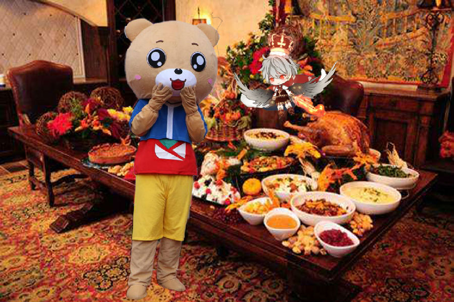 “时间到!让我来看看……”三炙鸟挥了挥手上的针线,进行清点。“小娜做的不错嘛,莉莉也不错呢,哦,熊熊熊你好厉害啊!这么长一串!”三炙鸟看着熊熊熊面前好长一串的秸秆串赞叹,“我宣布,蔓越秸秆比赛,熊熊熊获胜!”“耶!”熊熊熊跳起来欢呼着,看着被三炙鸟端来的一大只禽类。“这是你的奖品哦,美食三炙鸟!你知道三炙鸟是怎么做的嘛?”三炙鸟躲开熊熊熊的扑击,问到。“唔……这个……”“我知道,我的部员和我说过。”小娜在一边说,“是在一只脱骨鹅里面塞一只脱骨鸭,然后再脱骨鸭里面塞一只脱骨鸡,三层炙烤,所以叫三炙鸟。”小娜讲得头头是道。“对啦,那么想用你们的大餐吧!”三炙鸟笑着说,火鸡和美式玉米面包一起飘了过来,笑嘻嘻地看着众人享用着感恩节的美食和感恩节的游戏,一起学习感恩节的知识。