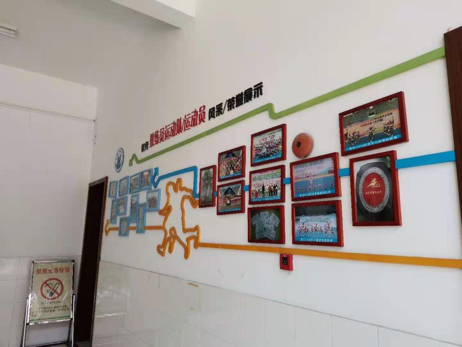 在操场的个后方还有一个体育场,里面挂着运动员们的风采