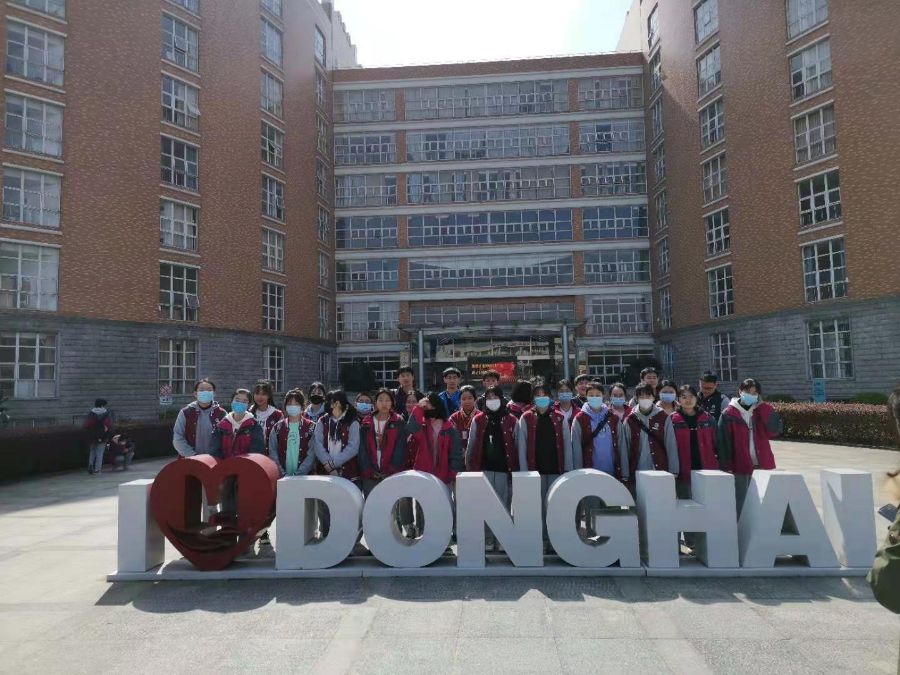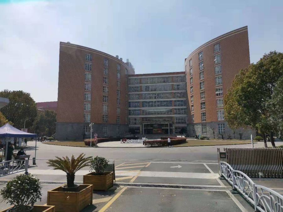 到了门口,映入眼帘的是我们东海学院的主教学楼,楼体成一个大大的“D、H”字样,意为“东海”,属实壮观。